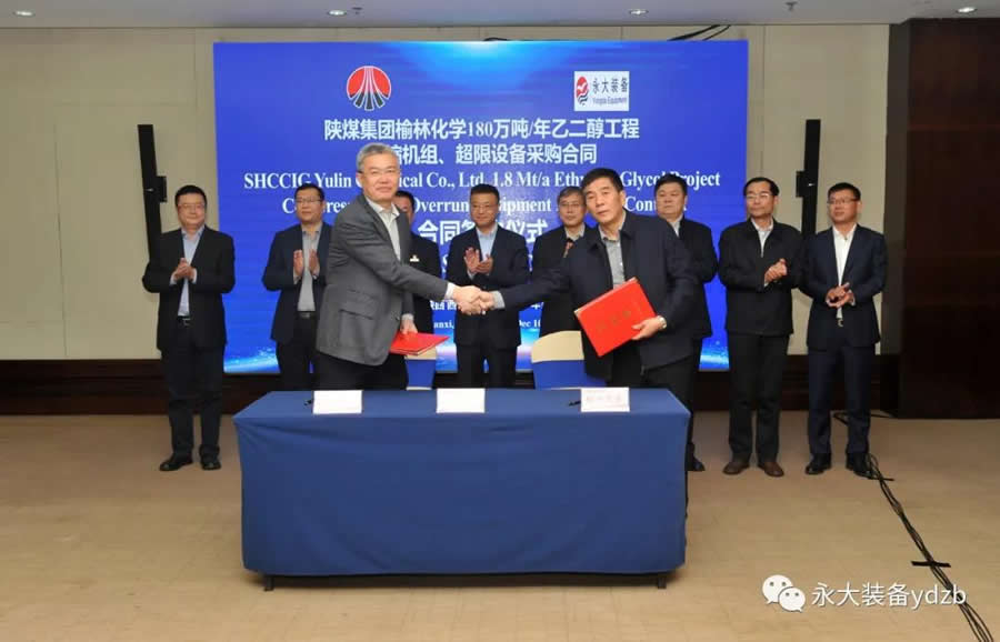 江蘇永大化工機械有限公司董事長李進與陜煤榆化黨委副書記、總經(jīng)理王會民分別代表雙方簽署了180萬噸/年乙二醇工程超限設備采購合同。