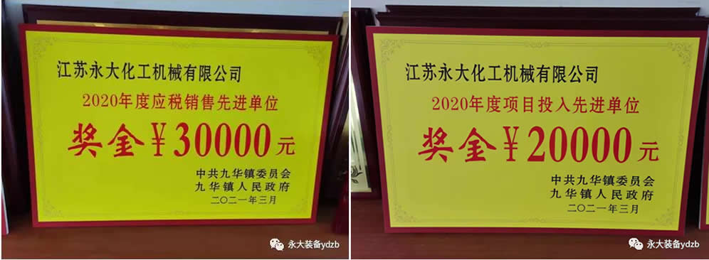 大會對2020年度做出顯著成績和突出貢獻(xiàn)的先進(jìn)集體、先進(jìn)個人予以表彰。江蘇永大化工機(jī)械有限公司榮獲“納稅十強(qiáng)企業(yè)”、“應(yīng)稅銷售先進(jìn)單位”、“項目投入先進(jìn)單位”“安全生產(chǎn)工作先進(jìn)集體”等榮譽(yù)稱號,并獲企業(yè)規(guī)模升級獎、應(yīng)稅銷售增長優(yōu)勝獎、高企培育獎、研發(fā)投入獎、產(chǎn)學(xué)研合作獎等多項榮譽(yù);公司董事長李進(jìn)被授予“優(yōu)秀企業(yè)家”榮譽(yù)稱號。
